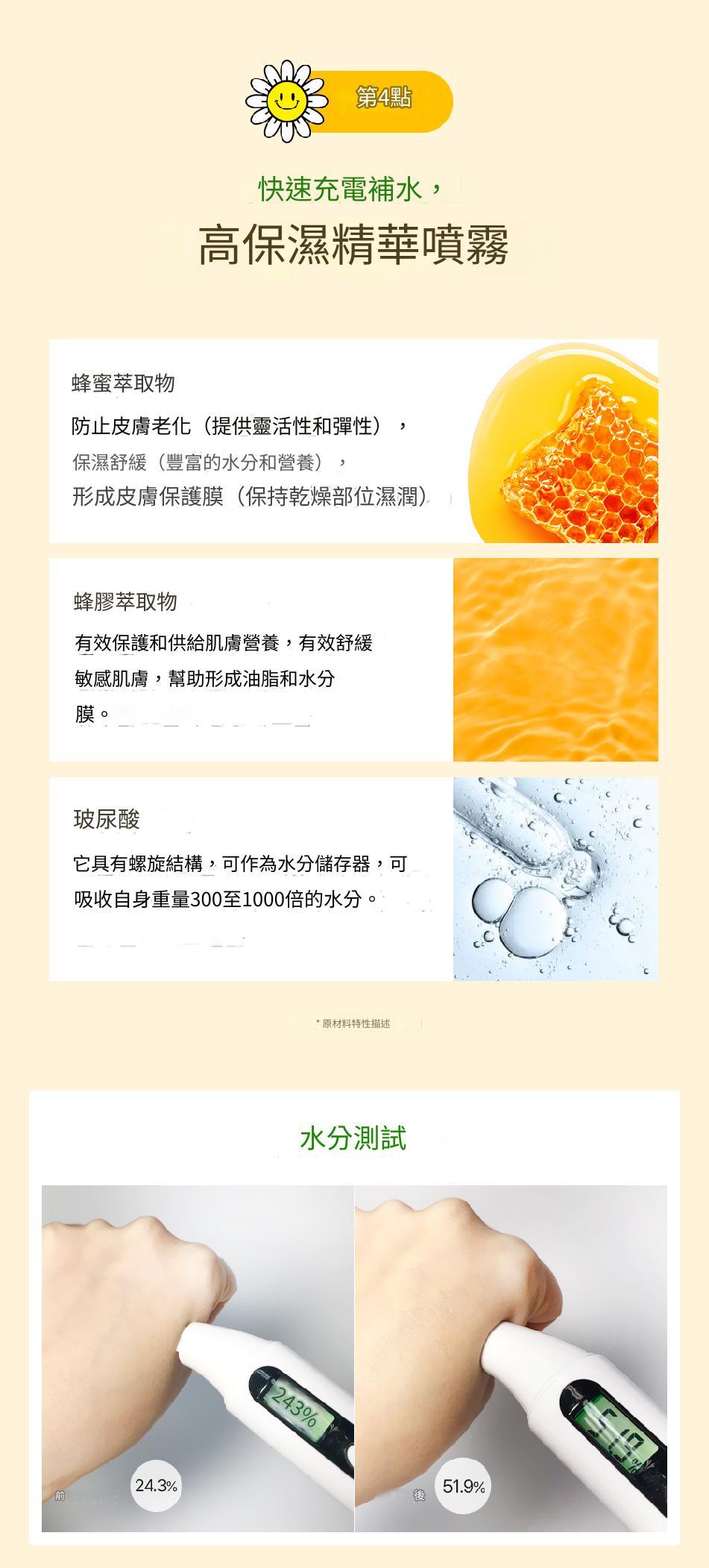 玻尿酸、蜂膠、蜂蜜、泛醇等保濕營養成分讓肌膚紋理光滑有光澤‧ 柔和舒緩受刺激的肌膚,快速吸收後帶來清爽⽔潤的保濕效果
