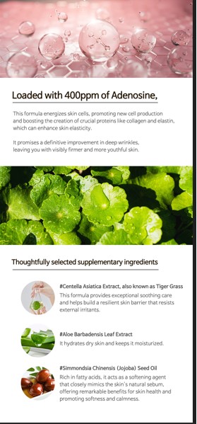 添加400ppm腺苷成份,使肌膚細胞注入活力,並促進膠原蛋白增生,增進肌膚彈性